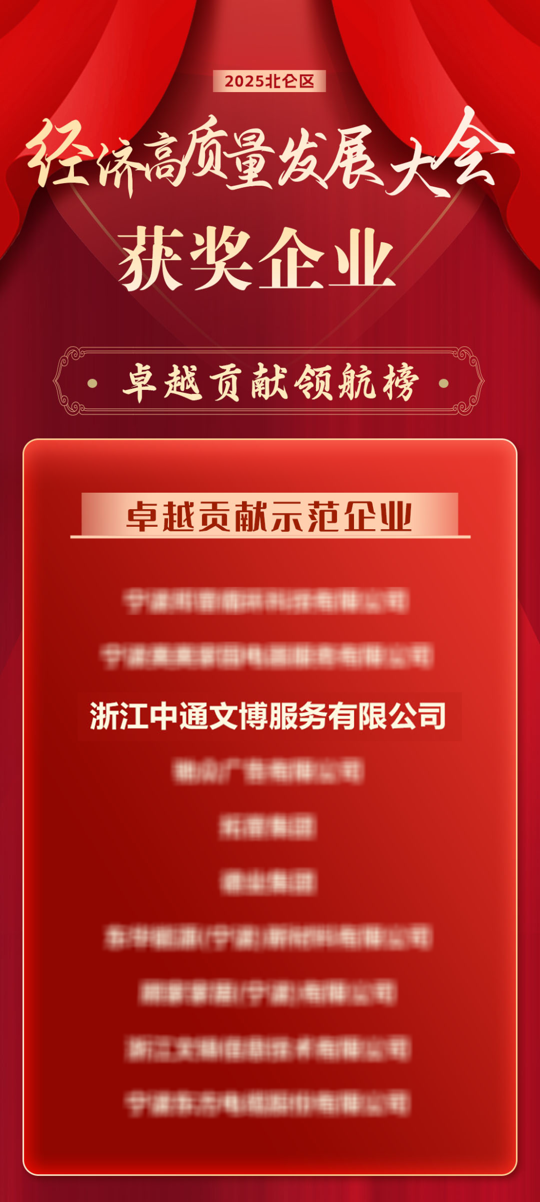 2025年3月28日,在宁波北仑举行的“潮涌东方看北仑——2025年北仑区经济高质量发展大会”上,浙江中通文博服务有限公司凭借在人力资源领域的创新实践和产业贡献,再次荣膺“卓越贡献示范企业”称号,这已是中通文博连续第二年获此殊荣。