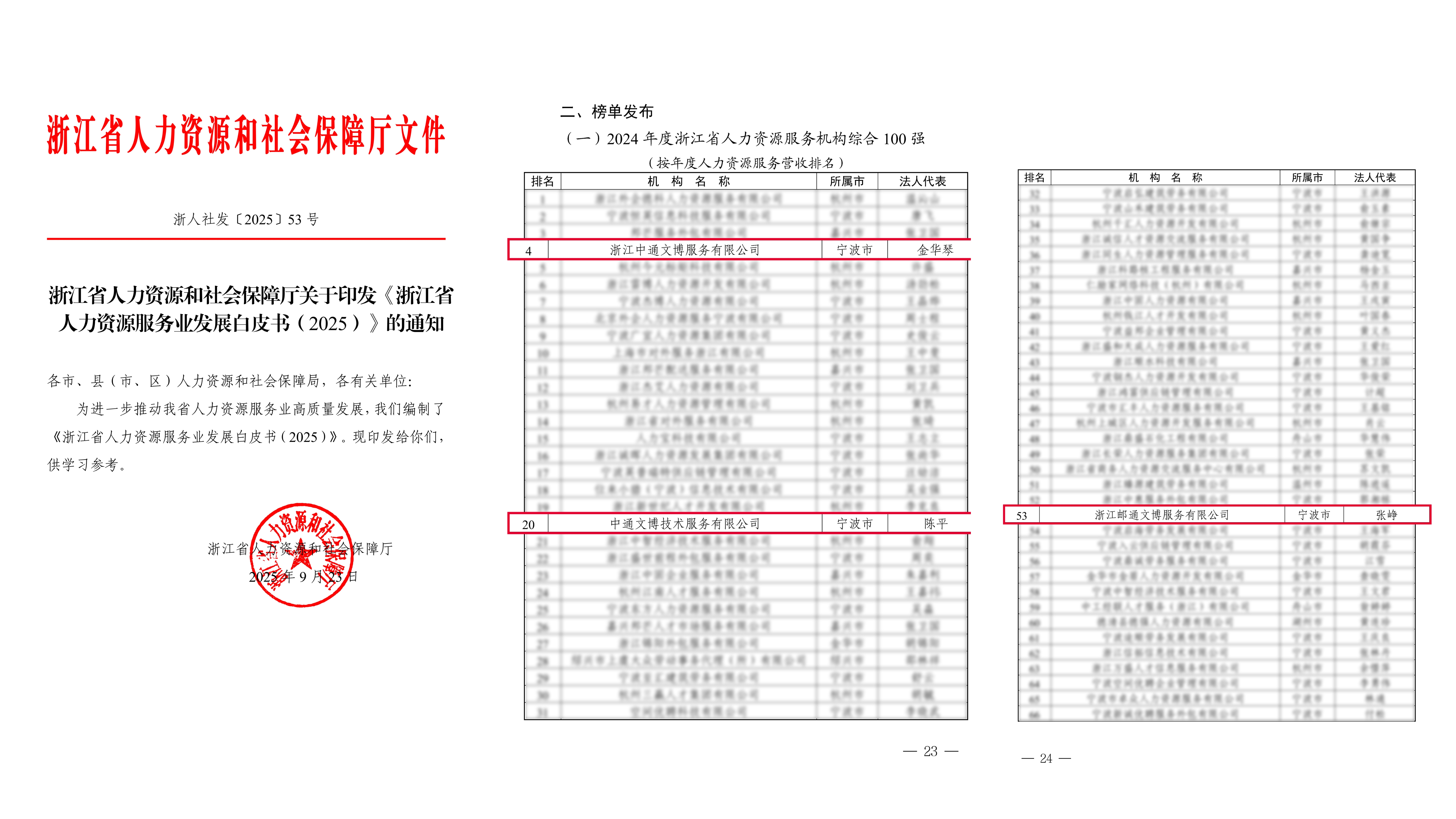 此次发布的《白皮书》同步揭晓了“2024年度浙江省人力资源服务机构综合100强”等8项榜单。自2019年起,浙江省已连续7年发布人力资源服务业专项榜单,成为衡量区域行业发展水平的重要风向标。在本次“2024年度浙江省人力资源服务机构综合100强”榜单中,浙江中通文博服务有限公司凭借深厚的服务积淀与行业影响力,荣登第4位,实现连续七年稳居榜单前列的亮眼成绩。