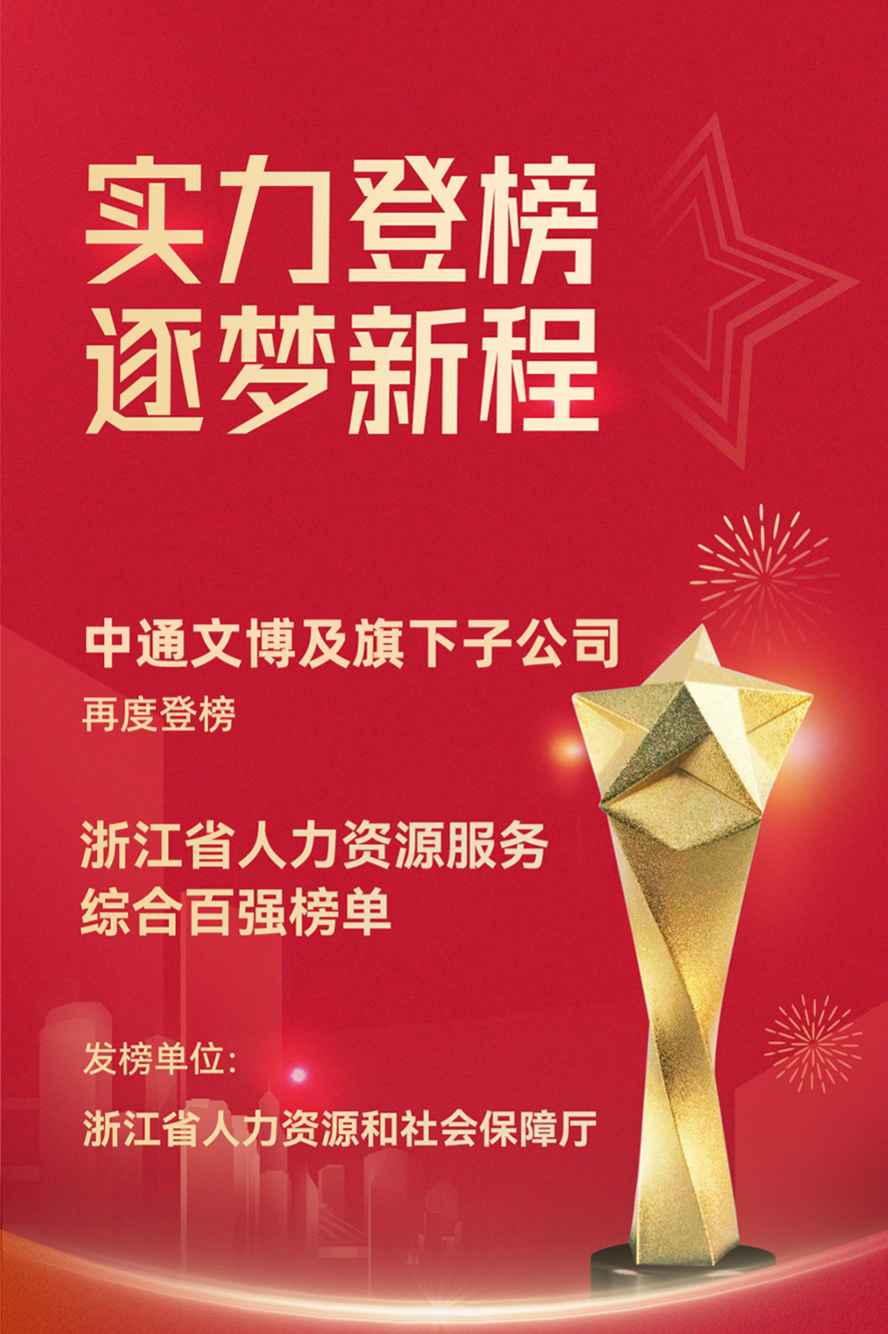 连续七年稳居行业百强前列,既是浙江省人力资源与社会保障厅等行业主管部门对中通文博服务实力的权威肯定,也是广大客户对其服务价值的高度认可。未来,中通文博将持续发挥行业引领作用,以创新为核心驱动力,进一步升级人力资源服务模式,提升专业化、精细化服务水平,为企业客户及社会各界提供更丰富、更优质、更多元化的人力资源解决方案,并携手行业伙伴、企业及社会力量协同奋进,为浙江省人力资源服务业高质量发展注入强劲动能。
