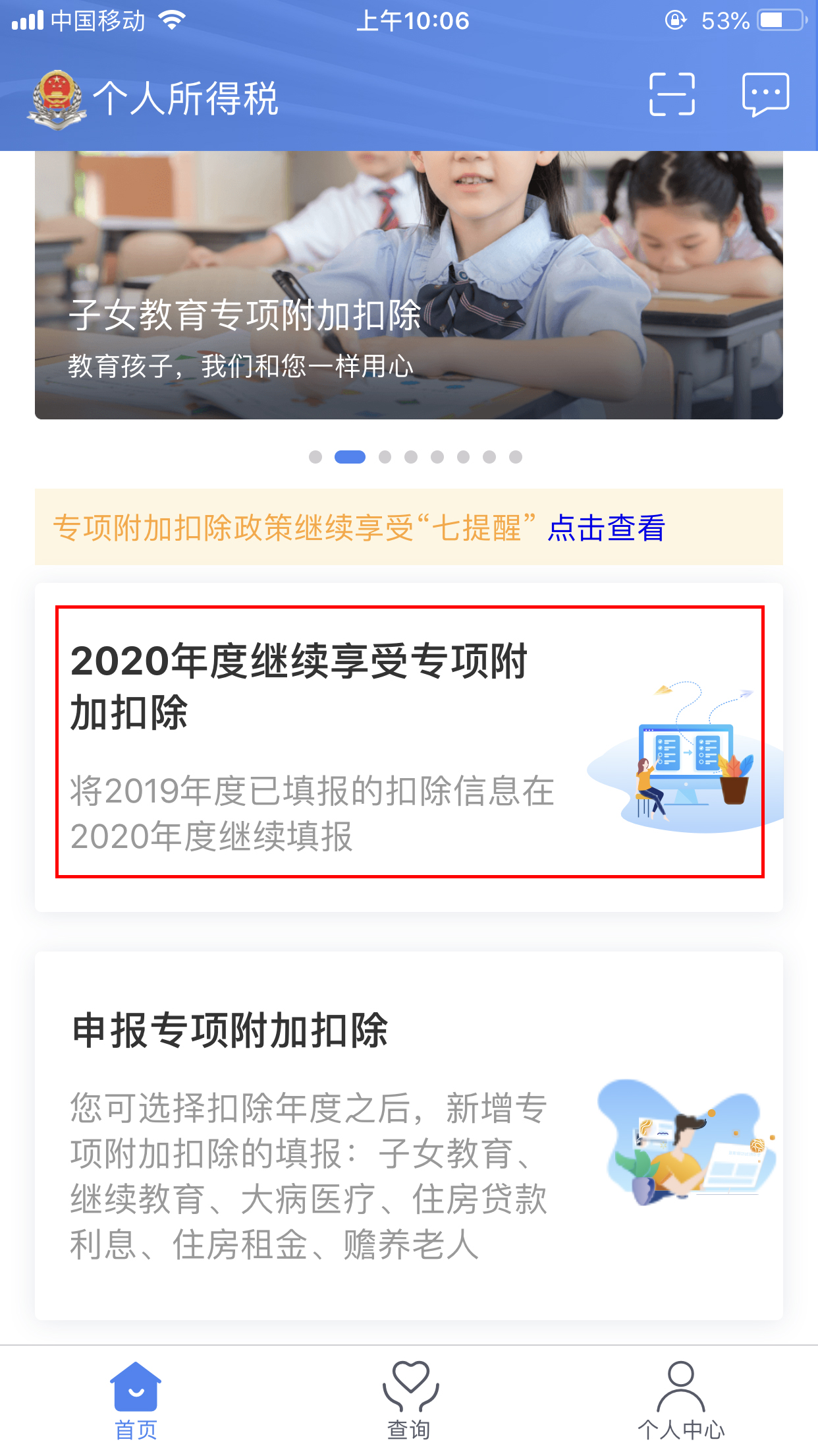 点击【2020年度继续享受专项附加扣除】模块。