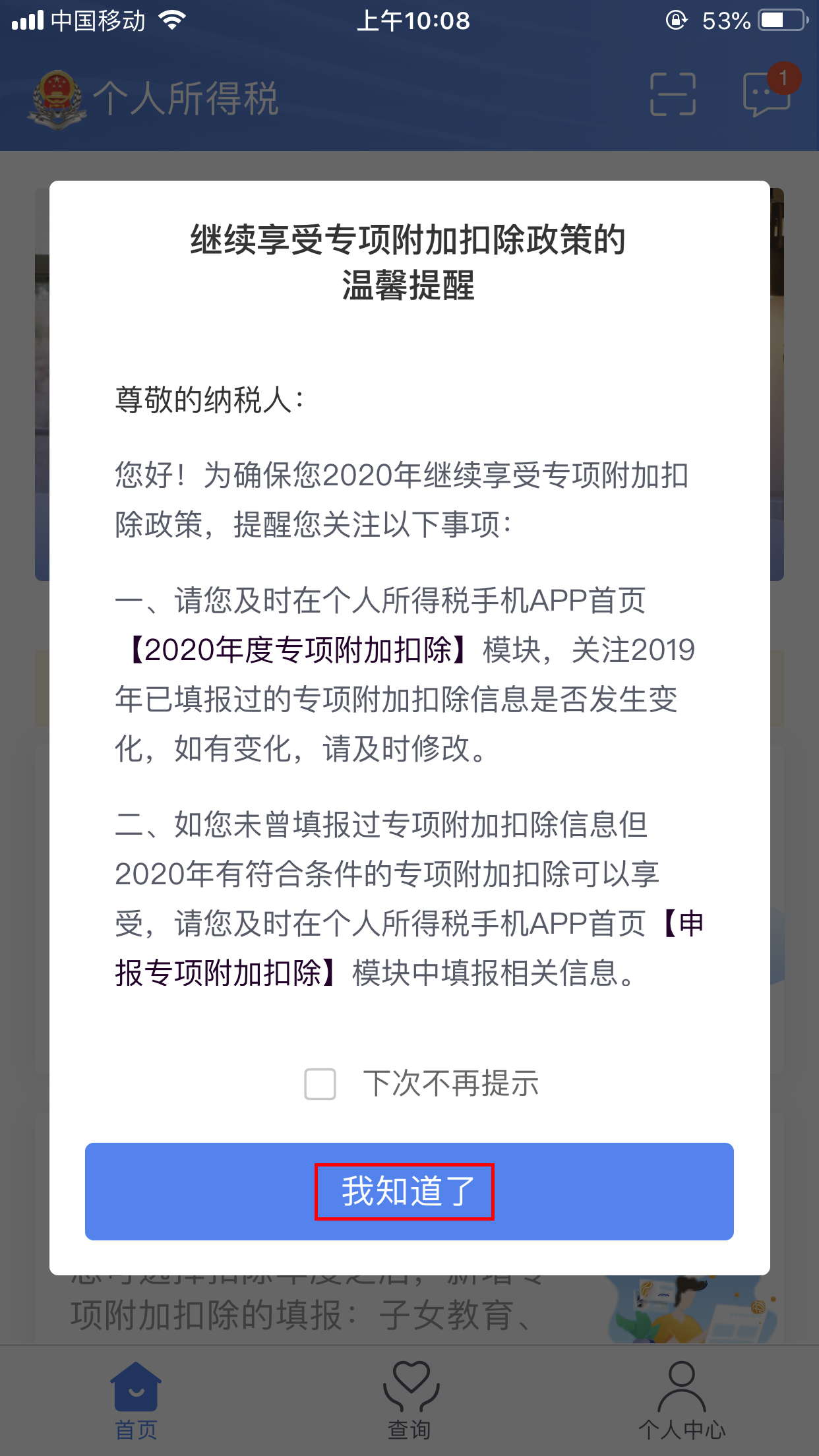 弹出温馨提醒,点击“我知道了”。