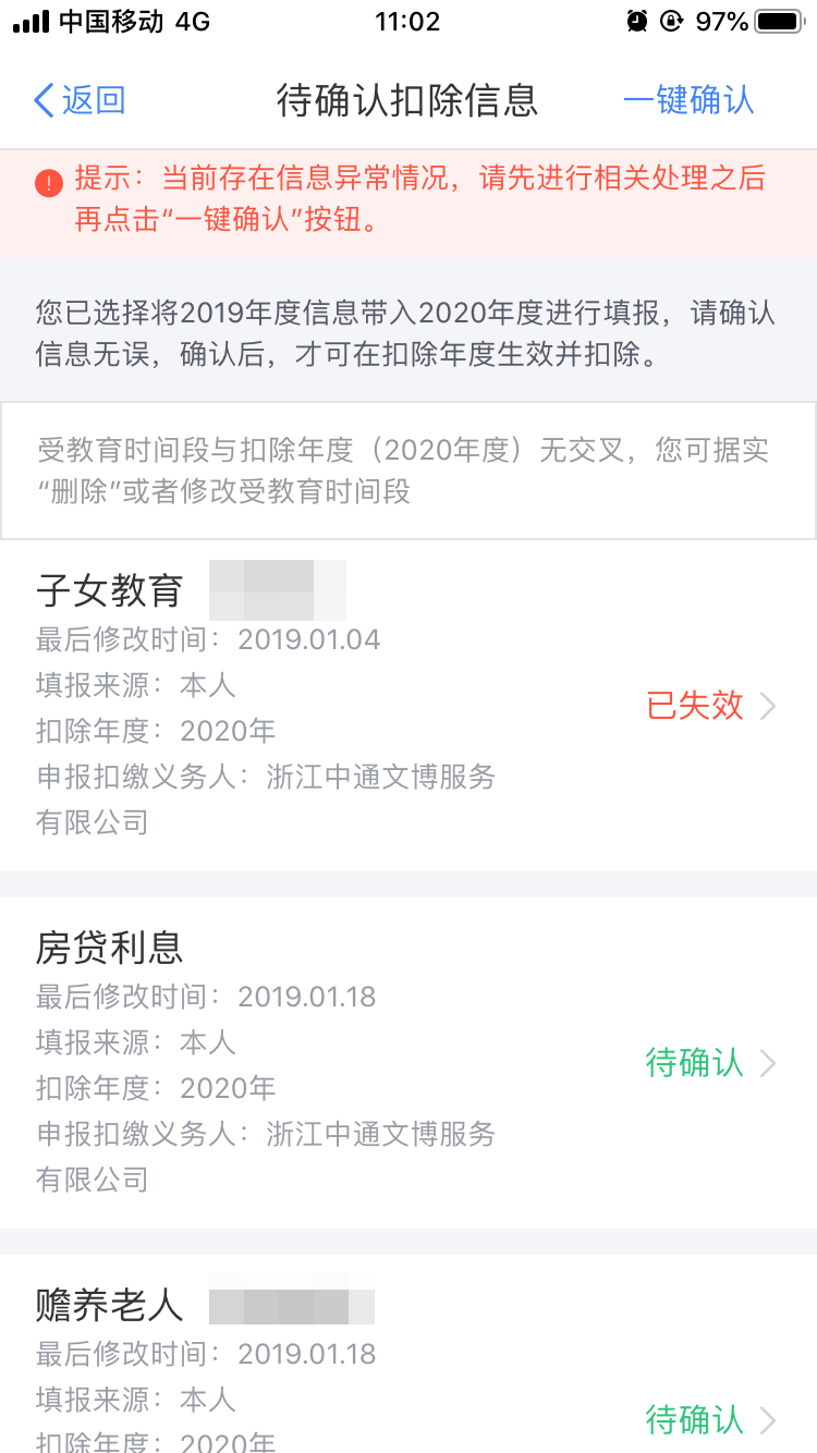 注意:如有“已失效”状态的信息,则需先删除或修改之后才能点击“一键确认”。