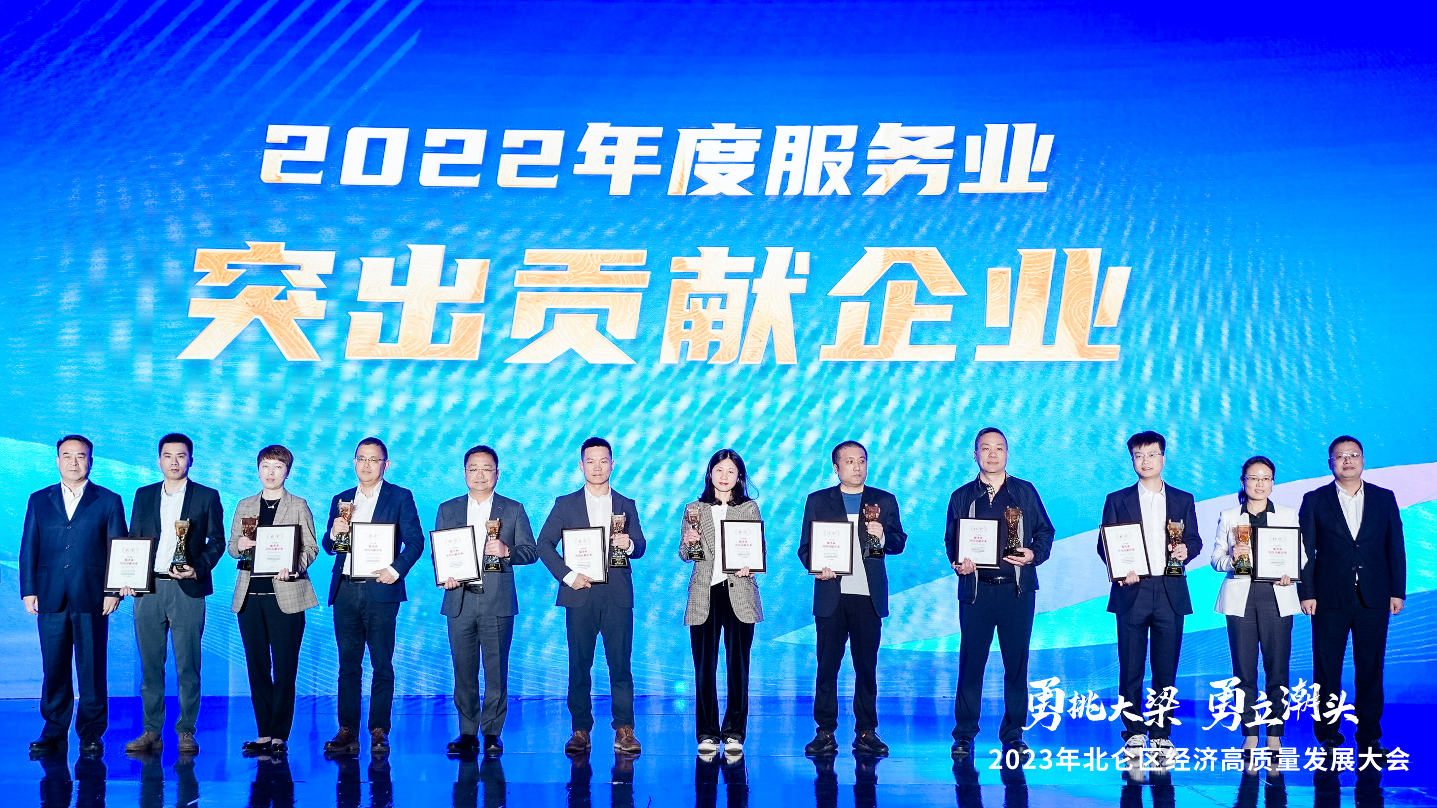 此次大会为8名企业家、105家企业、8家单位,颁发了2022年度北仑区人民政府质量奖、2022年度服务业突出贡献企业等15个奖项。中通文博荣获“宁波市北仑区2022年度服务业突出贡献企业”奖项。