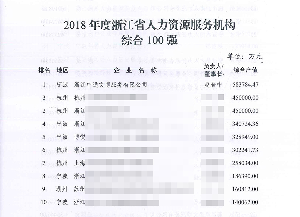 其中,在浙江省人力资源服务机构综合100强中,浙江中通文博服务有限公司以超过58亿元的综合产值位列榜首。