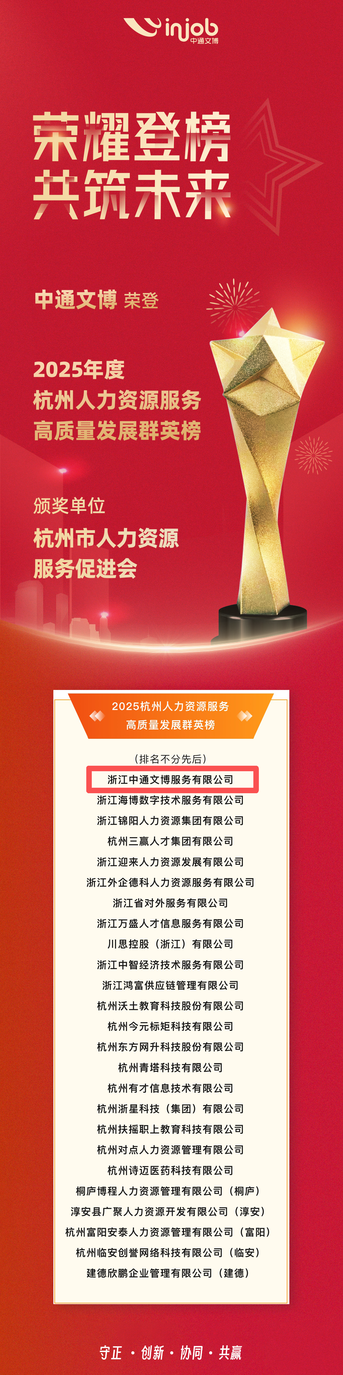 此次荣登群英榜,既是荣誉更是责任。未来,中通文博将继续以行业标杆为己任,持续深耕人力资源服务创新,不断提升服务品质与专业能力,为杭州乃至浙江人力资源服务业高质量发展注入更强动力,为更多企业与人才搭建高效对接桥梁,共筑人力资源生态新未来!